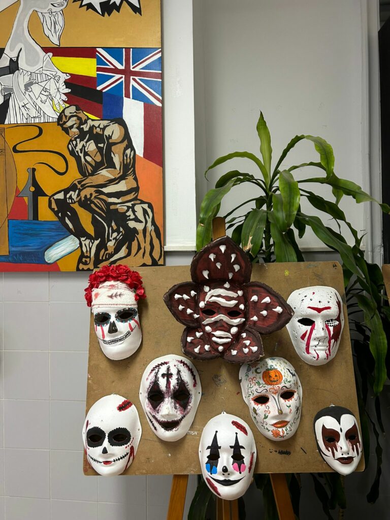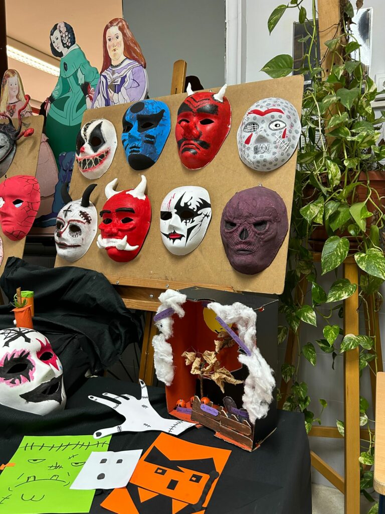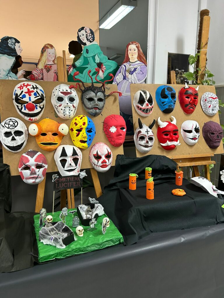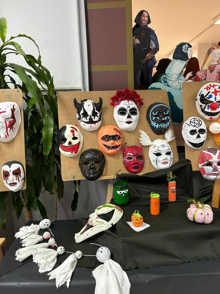 El alumnado de 3eso ha puesto ”cara al terror” com esta exposición de caretas desde plástica y se una tecnologia de 2eso con algunos adornos.