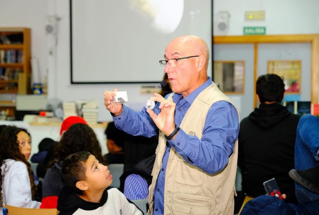 Charla a 3 clases de 1 de secundaria, desde Grunsber, la divulgaciónde los valores de Sierra Bermeja, en este caso, como observatorio astronómico. Como tema, la astronomía y la necesidad de personal cualificado en observatorios astronómicos, física, matemáticas, astrobiología, heliofisica y una larga lista de materias que para una investigación, podrían ser necesarios. Atentos, curiosos, pregúntones, han podido tocar dos meteoritos y ver desde mi mano, dos láminas de meteoritos uno de nuestra Luna y otro del planeta Marte. He tenido a un grupito que prometen algo diferente al resto.